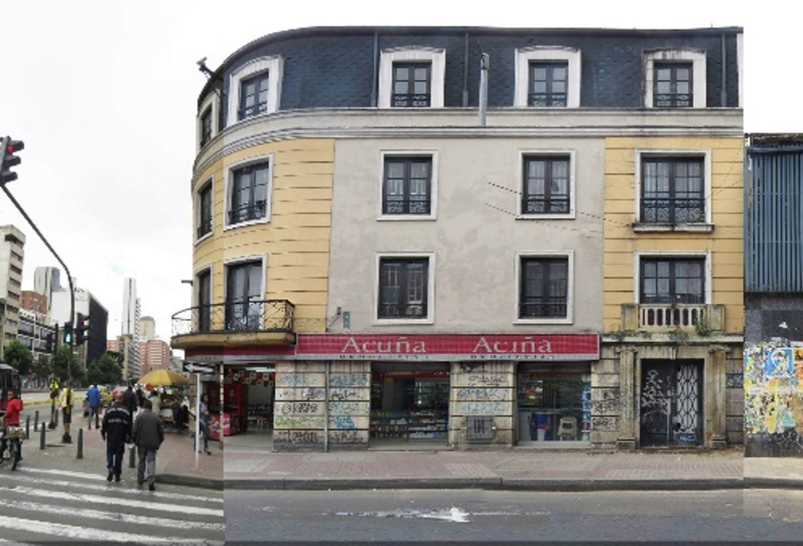 Conforma una unidad arquitectónica con el predio 003102003023. La parte sur del volumen, que abarca hasta el primer patio, hace referencia al predio 003102003006 cuyas dimensiones son: frente de 15.9 m y fondo de 14.4 m, logrando una proporción de 1 a 1,10 veces aproximadamente. La unidad arquitectónica está constituida por una edificación de 4 pisos paramentada en 2 predios con forma regular, cuyas dimensiones son: frente de 30.50 m y fondo de 14.6 m, logrando una proporción de 1 a 2,08 veces aproximadamente, con frentes sobre la Carrera Décima y la Calle 22. La ocupación de los predios se realiza a través de un volumen esquinero con 2 patios laterales. Las fachadas se componen de basamento, cuerpo intermedio y cuerpo superior de remate. El basamento tiene los accesos directos a los locales comerciales y a los pisos superiores. El cuerpo intermedio se estructura en 13 ejes donde se ubican las ventanas del segundo y tercer piso. En la esquina presenta un balcón. El cuerpo superior, a manera de mansarda comparte los 13 ejes del cuerpo intermedio con ventanas con sobremarco. En su fachada se destacan los almohadillados en piedra en su base y en el cuerpo intermedio con un pañete de mortero gris, la cornisa que separa el cuerpo intermedio del remate y la mansarda se encuentra revestida con pizarra. El sistema estructural es de muros de carga, carpintería en madera de puertas y ventanas.